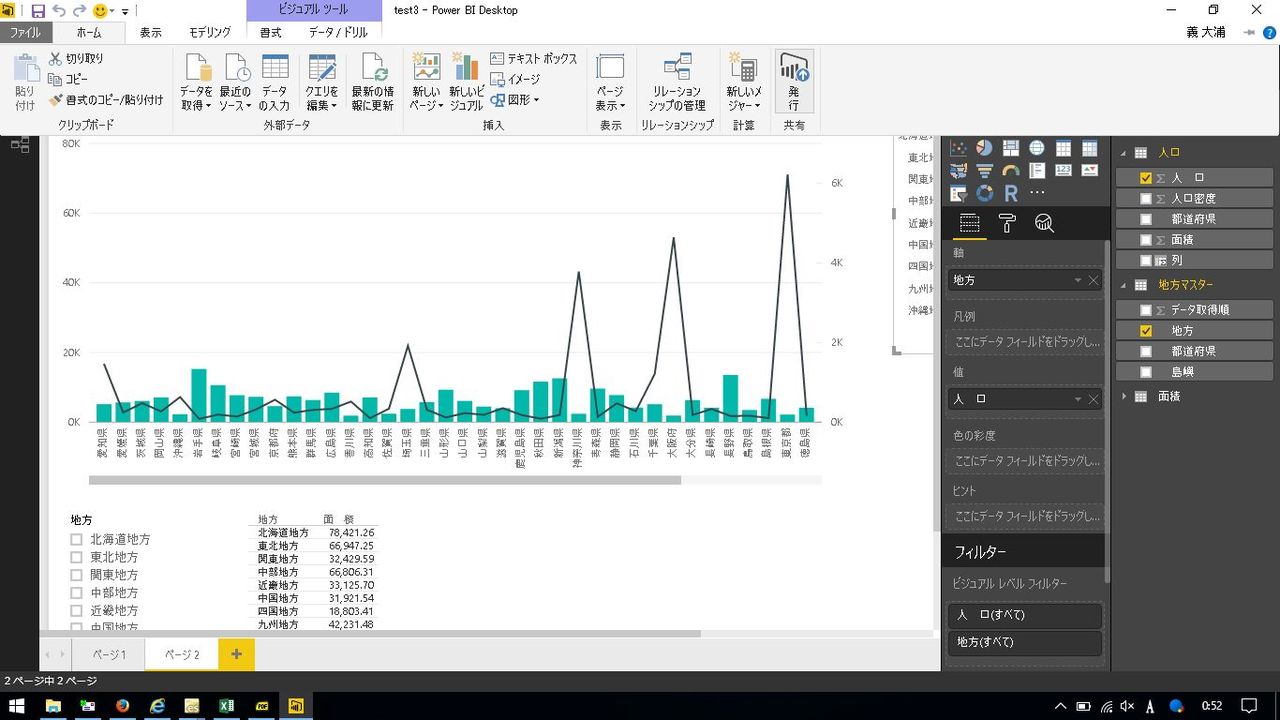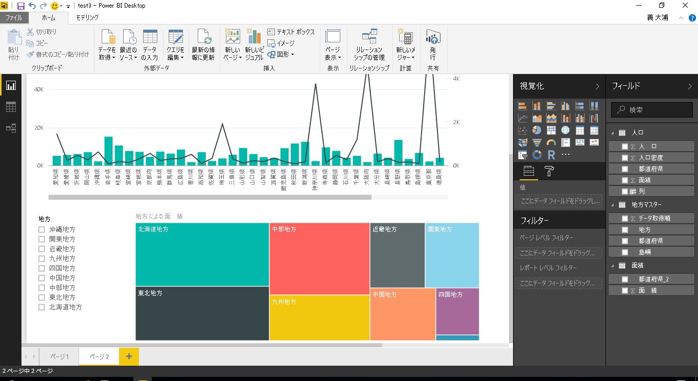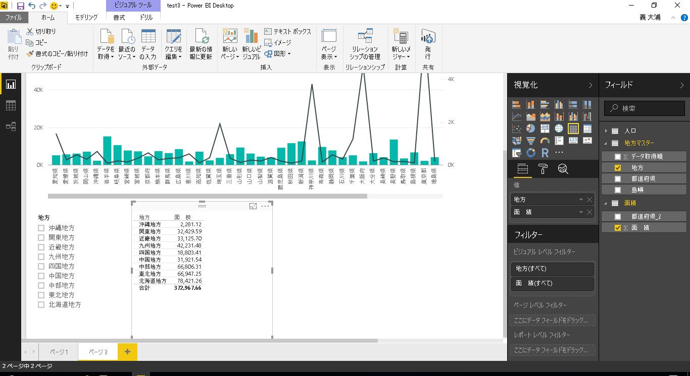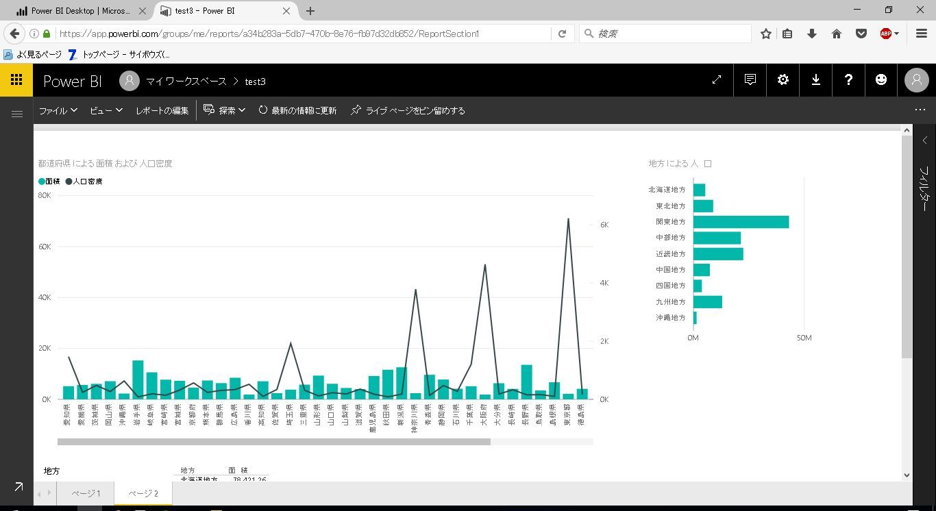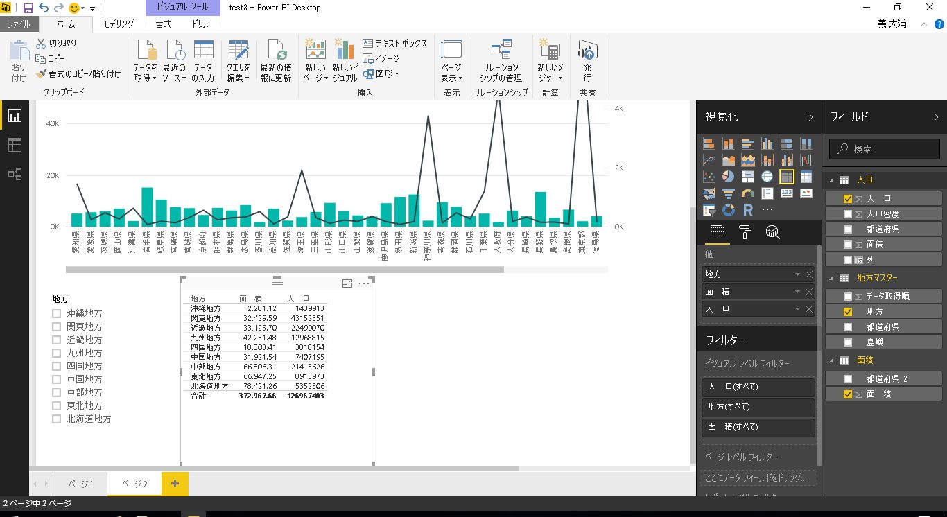 サンプルとして、前回利用した都道府県別の人口と面積のテーブルに地方マスタのテーブルを結合したレポートを利用します。