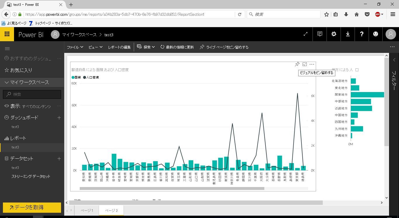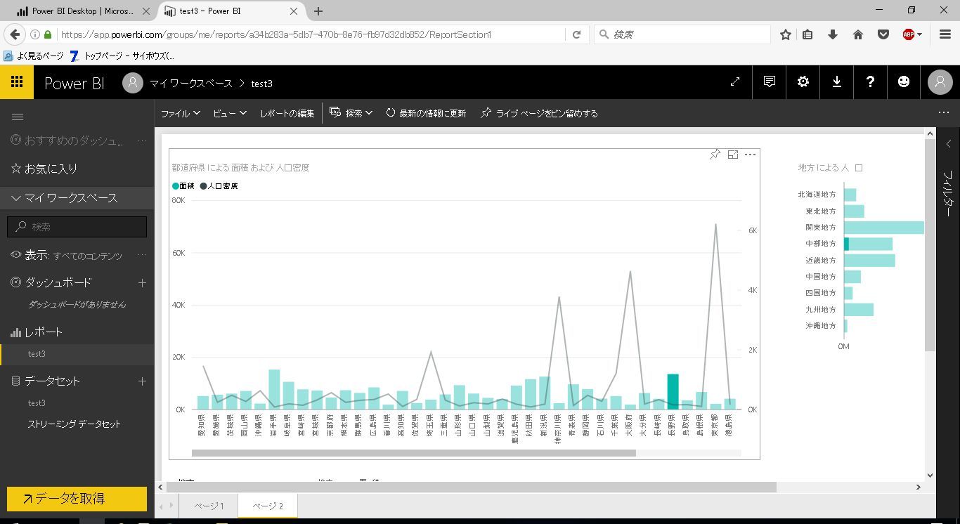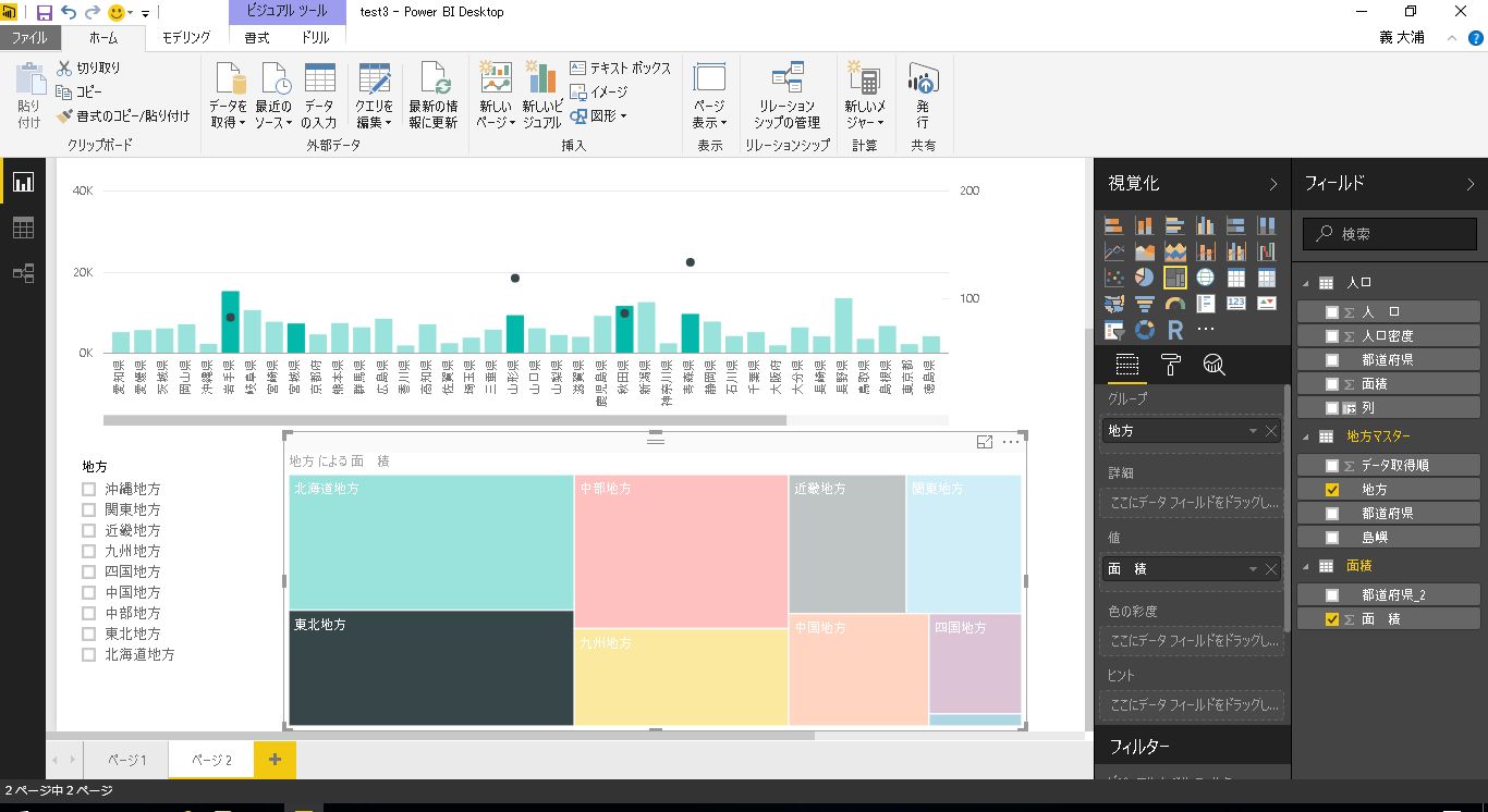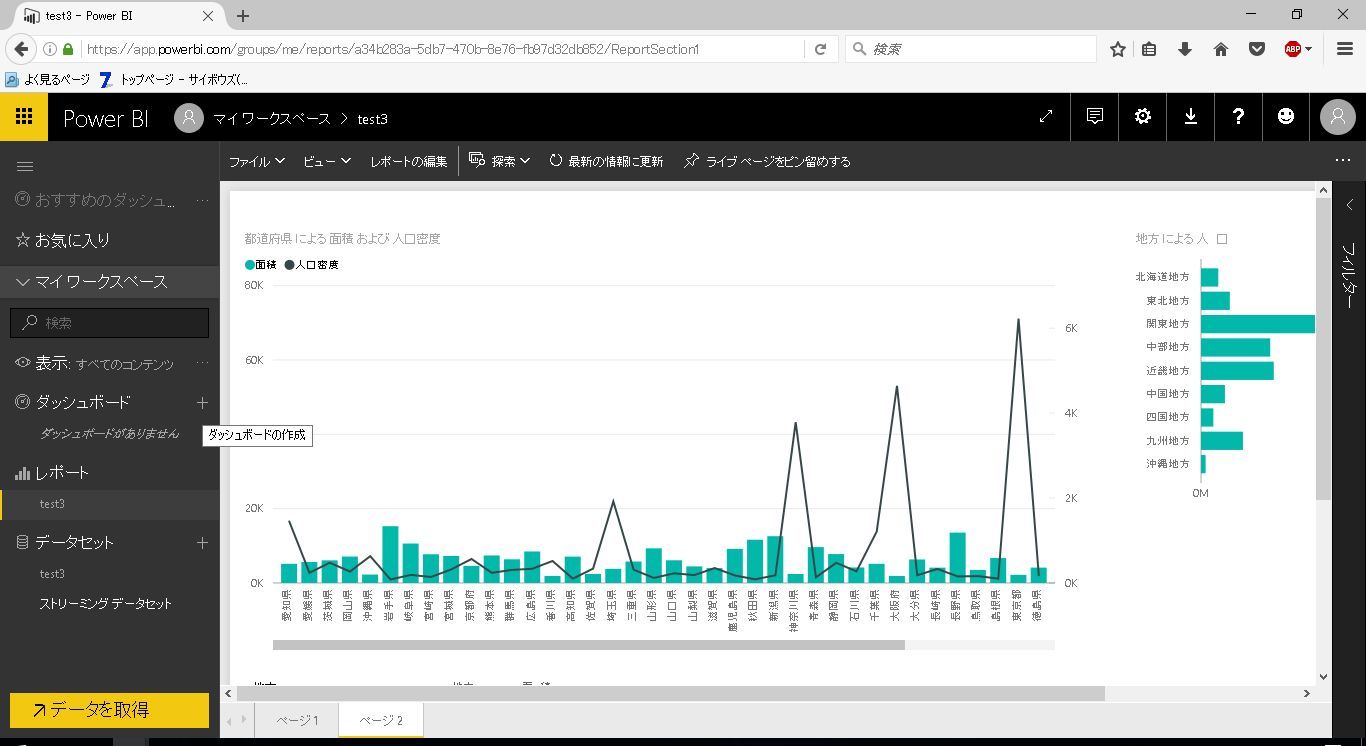 サンプルとして、前回利用した都道府県別の人口と面積のテーブルに地方マスタのテーブルを結合したレポートを利用します。