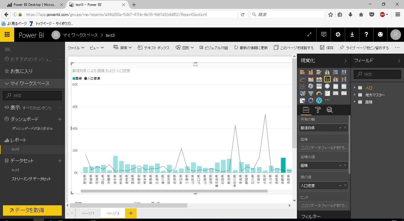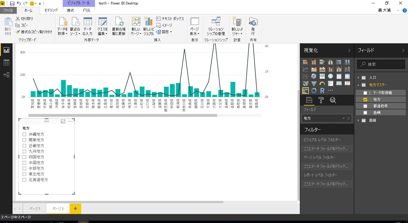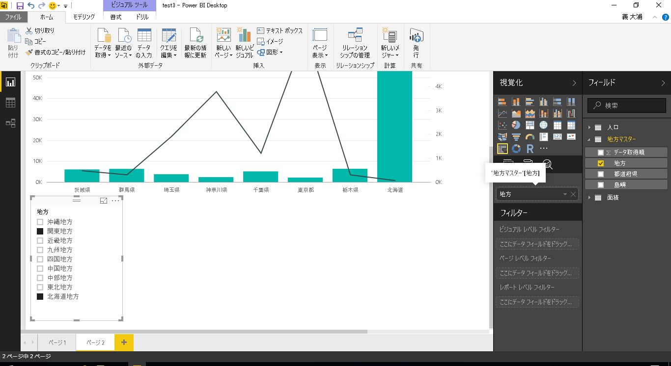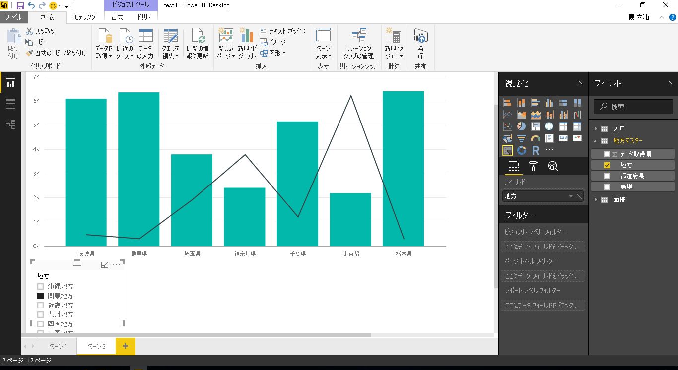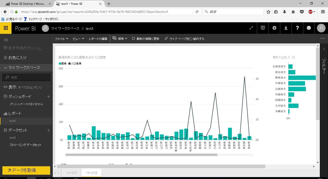 サンプルとして、前回利用した都道府県別の人口と面積のテーブルに地方マスタのテーブルを結合したレポートを利用します。