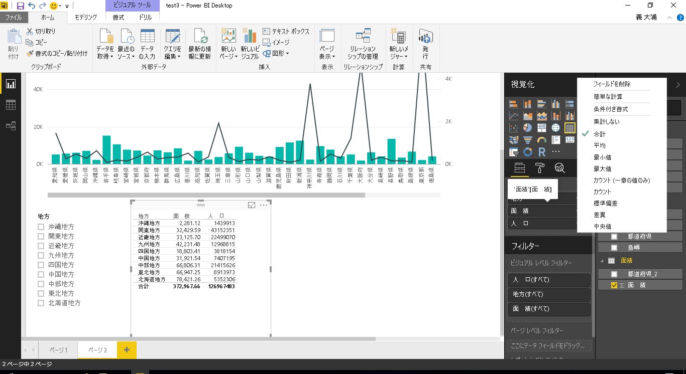 人口にもチェックをいれると各地方ごとの人口が集計されます。