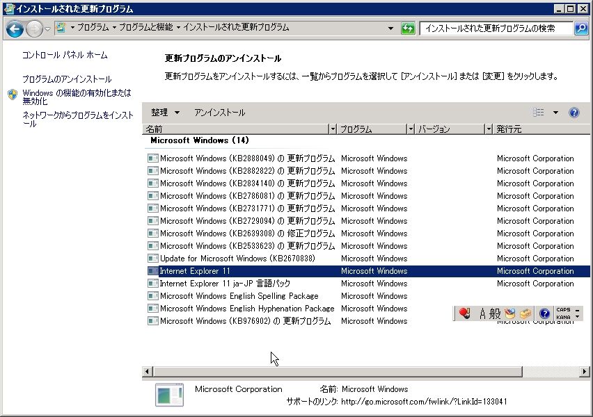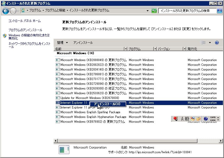 コントロールパネル→プログラム→プログラムと機能→インストールされた更新プログラムを開きます。