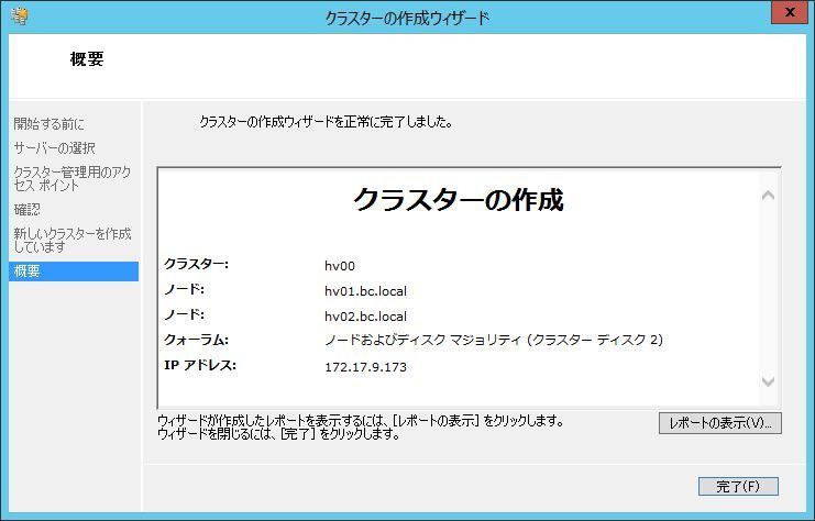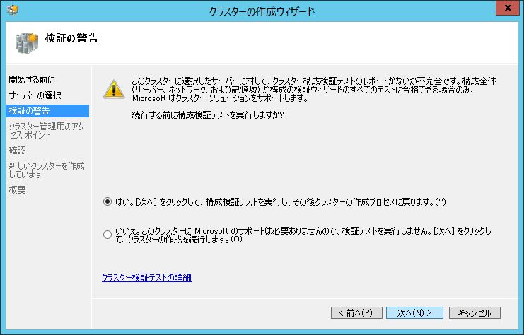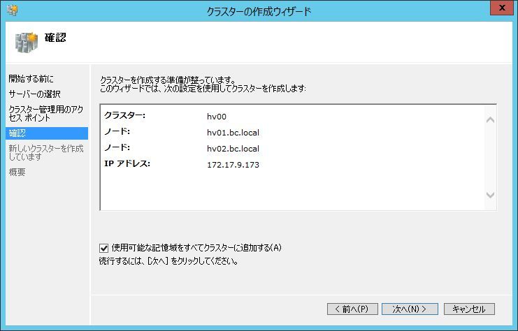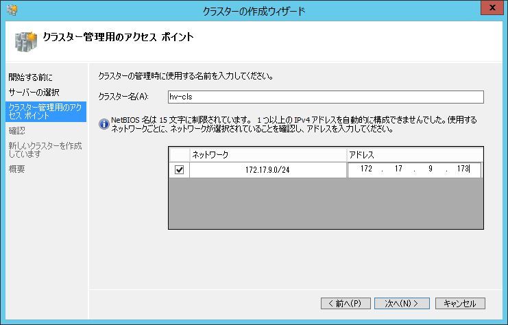 クラスタの作成ウィザードが継続するので、クラスタ名、クラスタIPを指定します。