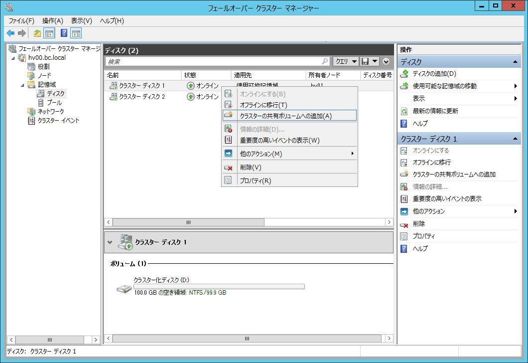 また、仮想マシンの配置するディスクはクラスタ共有ボリューム(CSV)に変換します。