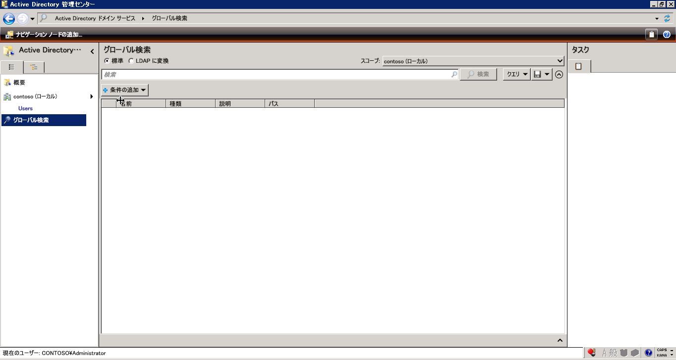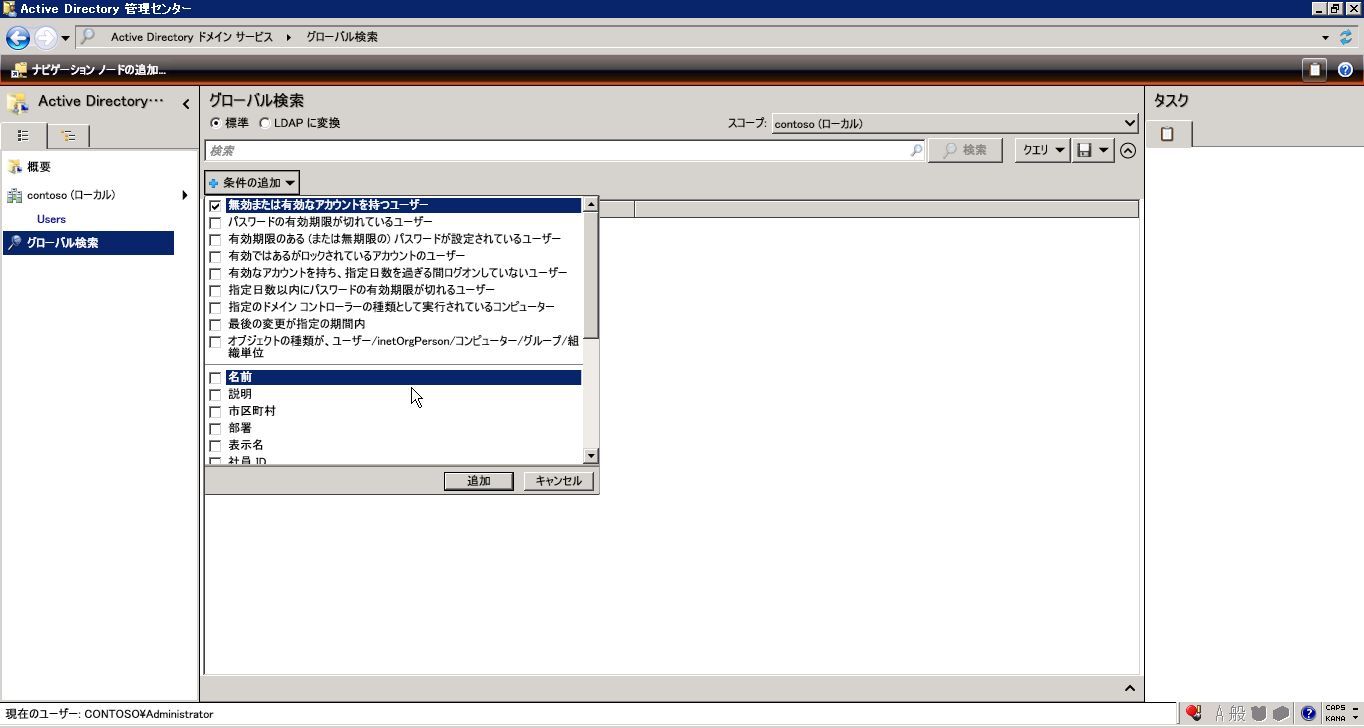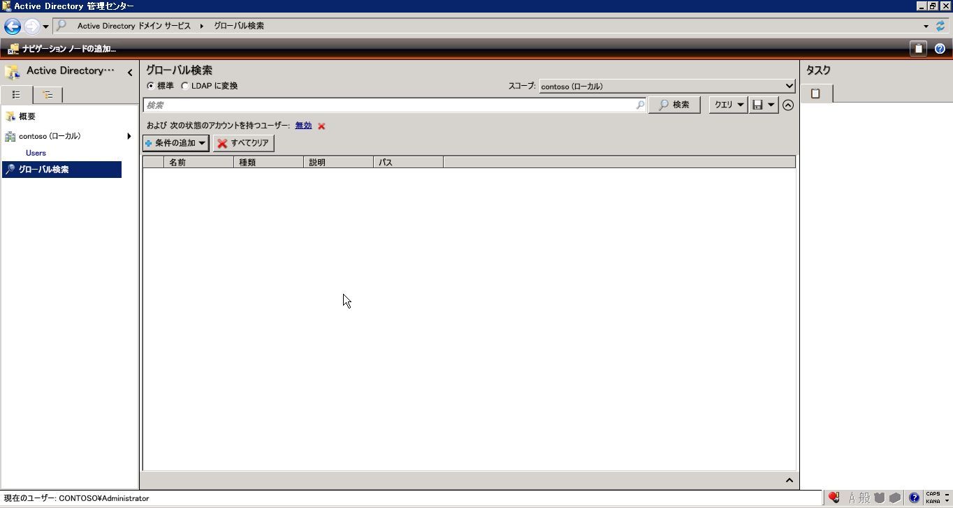 2013年07月14日 Active Directory-管理センターでラクラク管理 Windwos Server 2008R2より、「Active Directory管理センター」という新しいADの管理ツールが提供されました。 ユーザー登録画面もタブで分けられているというわけでなく、スクロールしながら見渡すことが出来るので、とても見やすいです。グローバル検索画面で細かい条件でユーザーを検索することができます。無効に設定されているユーザを検索しようとしているところです。無効と設定されていることを確認して検索ボタンを押します。目的のユーザーの一覧が表示されました。 「Active Directory」カテゴリの最新記事 < 前の記事次の記事 > コメント コメントフォーム 名前 コメント 評価する リセット リセット 顔 星 投稿する 情報を記憶