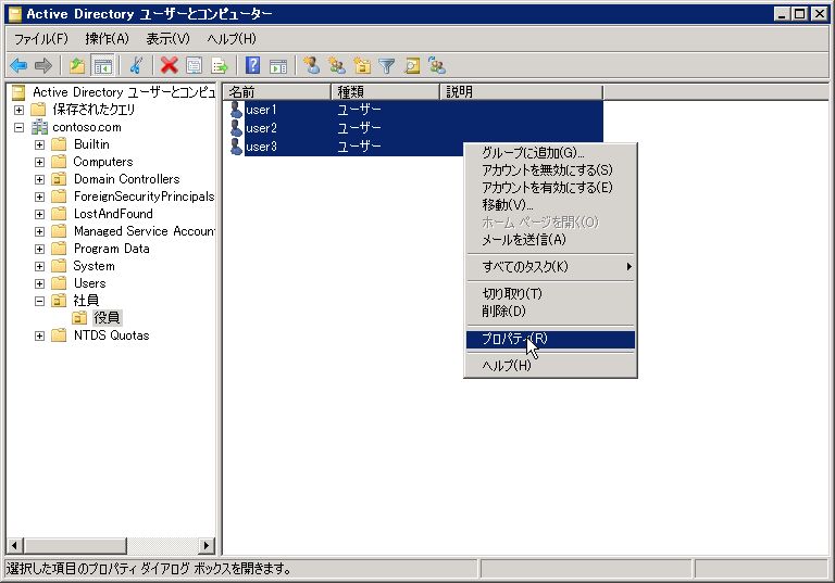 ユーザアカウントなどのADオブジェクトは「ユーザとコンピューター」画面で複数選択することで、一部プロパティを一括変更することができます。