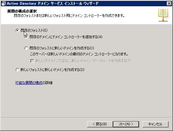 「既存のフォレスト」→「既存のドメインコントローラーを追加する」を選択します。