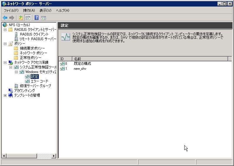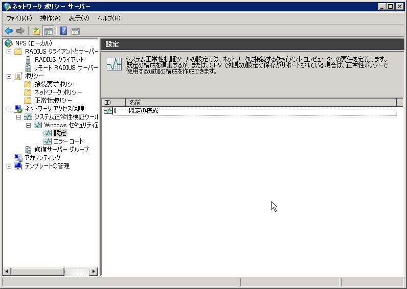 NPSコンソールより「ネットワークアクセス保護」→「システム正常性検証ツール」→「Windowsセキュリティ正常性検証ツール」→「設定」と進んで行きます。