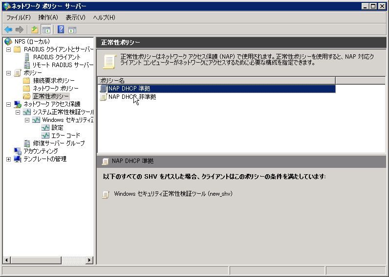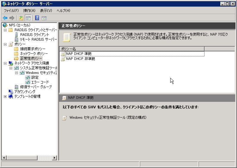 NPSコンソールより、「ポリシー」→「正常性ポリシー」を選択します。