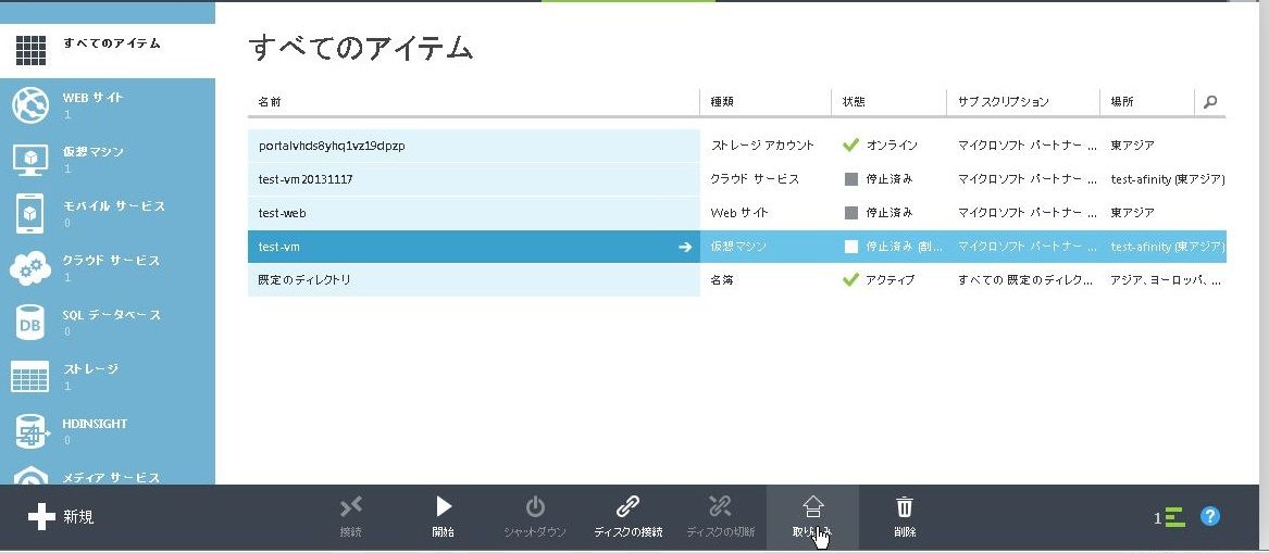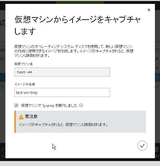 シャットダウン後に管理ポータルで仮想マシンを選択し、下にある「取り込み」をクリックします。
