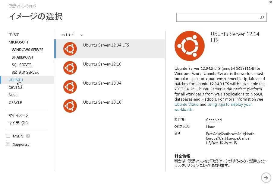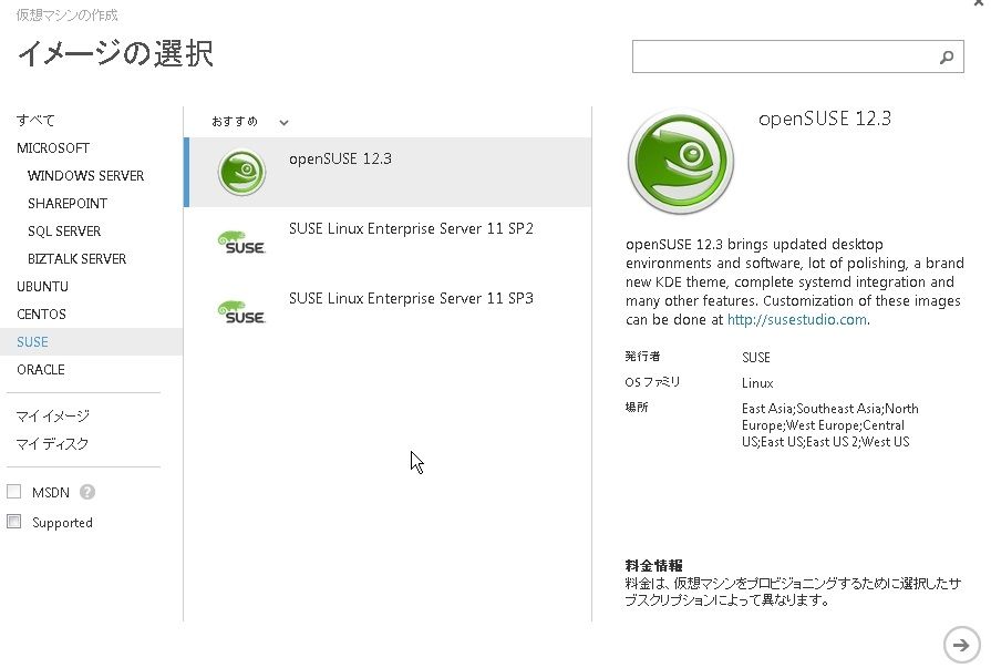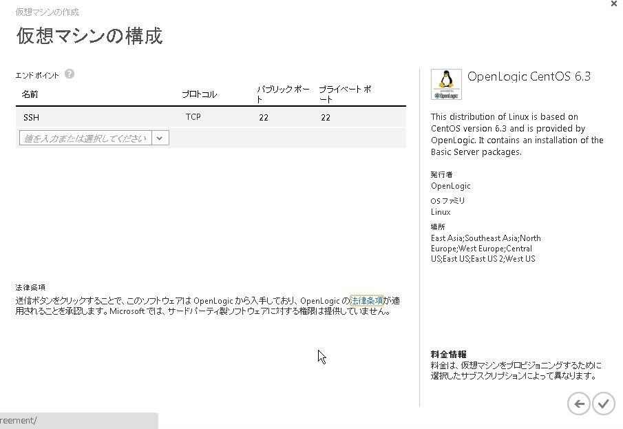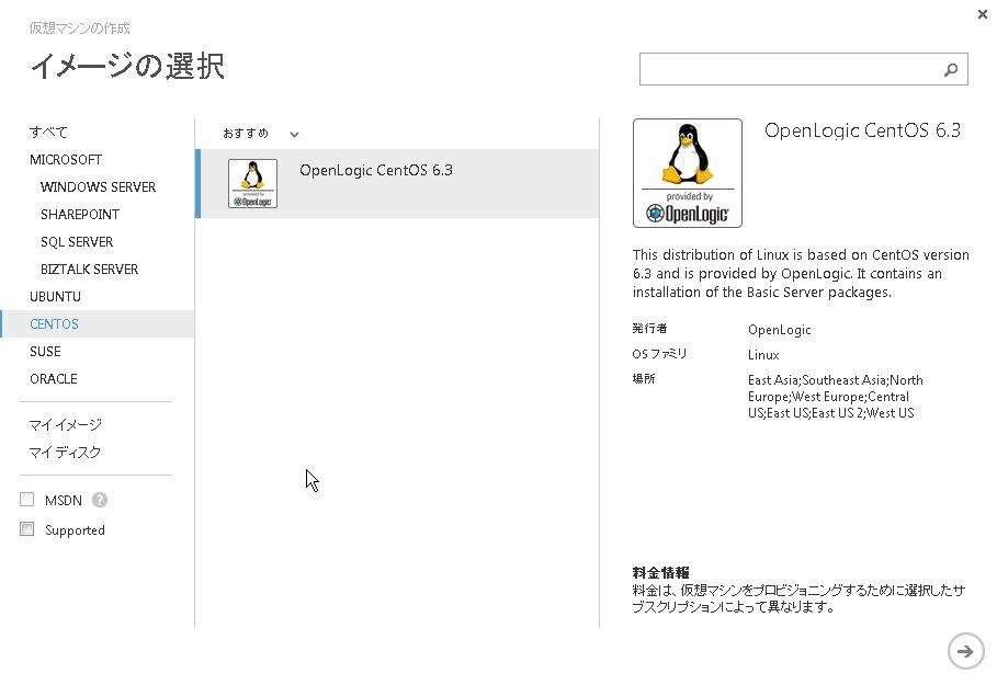 2013年11月22日 Windows Azure~仮想マシン(Linux)を作成する AzureではWindowsだけでなく、Linuxの仮想マシンも作れます。まだ、サポートされるLinux OSは少ないようですが・・・ギャラリーを見るとubuntu、centos、suseがあります。今回はcentos(6.3)で構築してみました。 ポートは22番のみがデフォルトでオープンします。 出来ました。SSHで接続してみましょう。 接続できました。 「Windows Azure」カテゴリの最新記事 < 前の記事次の記事 > コメント コメントフォーム 名前 コメント 評価する リセット リセット 顔 星 投稿する 情報を記憶