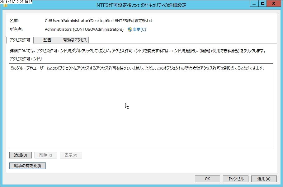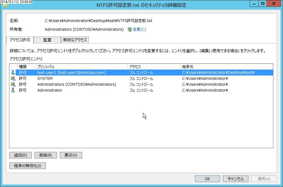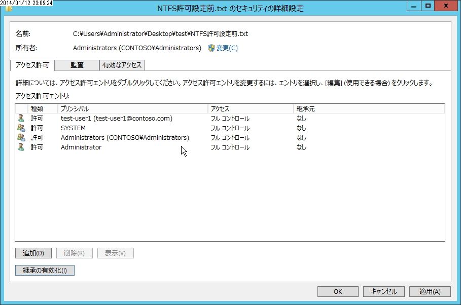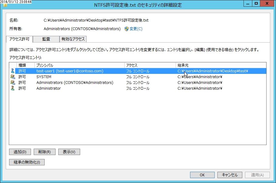 こちらからtestフォルダからアクセス許可が継承されてきたことがわかります。