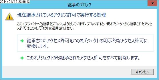 現在、継承されているアクセス許可をどうするのか、選択する画面が表示されます。