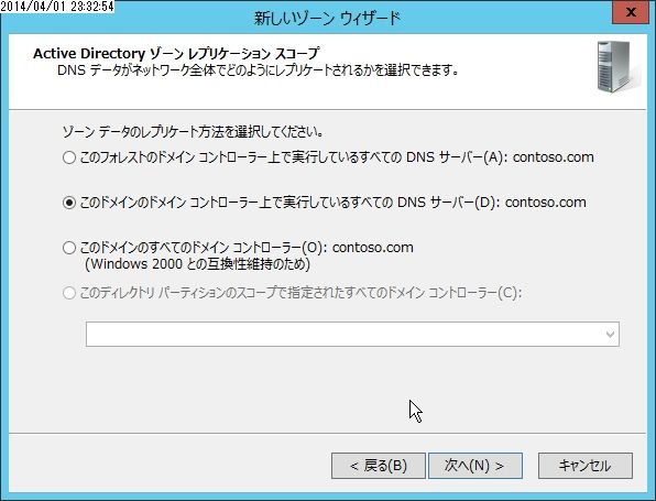 Active Directory統合ゾーンを作成する場合、ゾーンを複製(レプリケート)する範囲を選択します。
