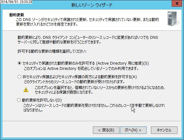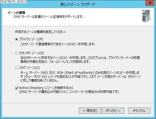 Active Directoryにゾーンを格納したい場合は下のチェックボックスにチェックを入れます。