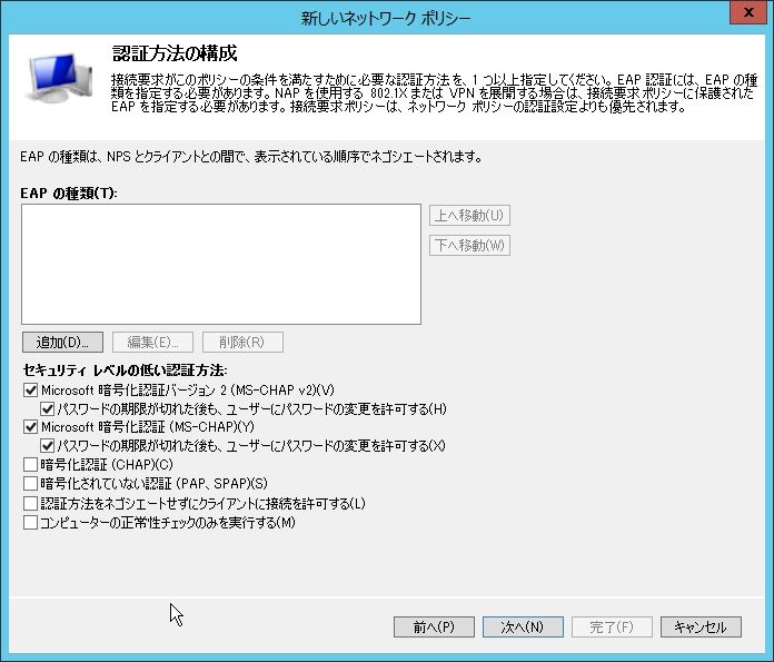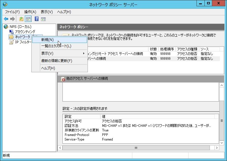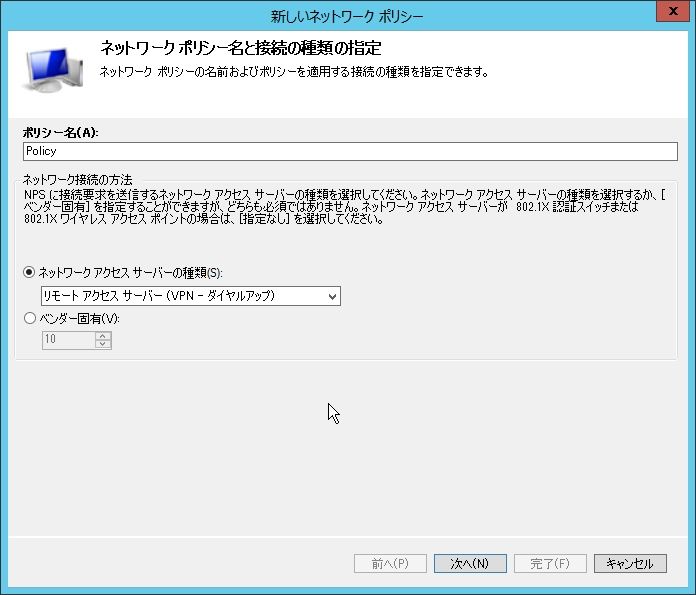 ネットワークポリシー名とアクセスサーバの種類を選択します。