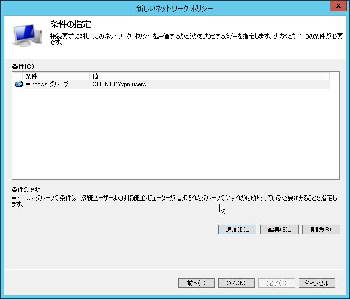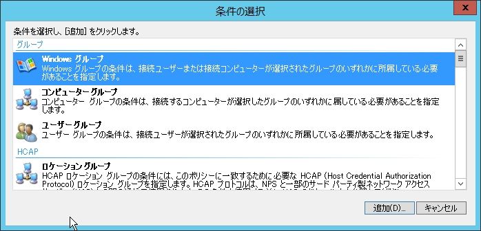 「条件の選択」からWindows グループを選択して、追加ボタンをクリックします。
