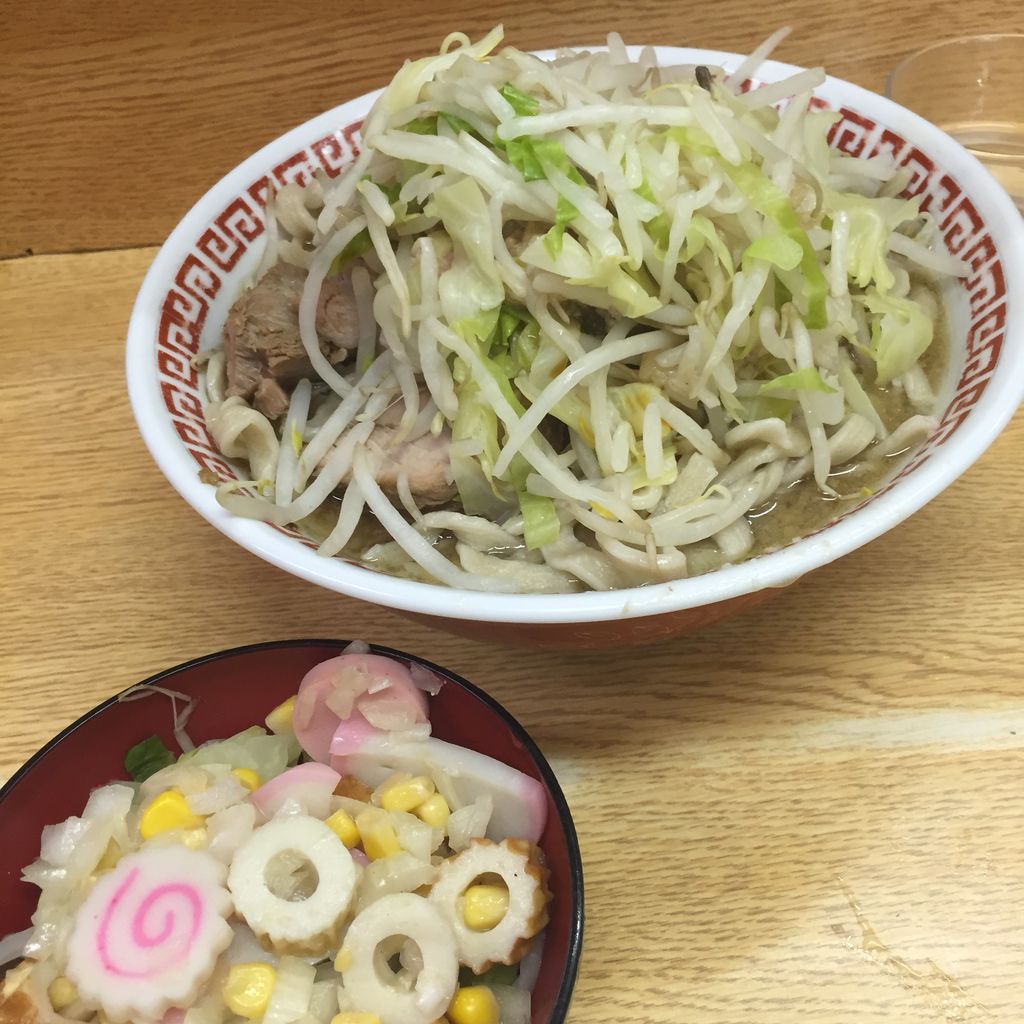 いつも通りの小ラーメンアブラ辛めに、この日の限定トッピングの「男ちゃんぽん」